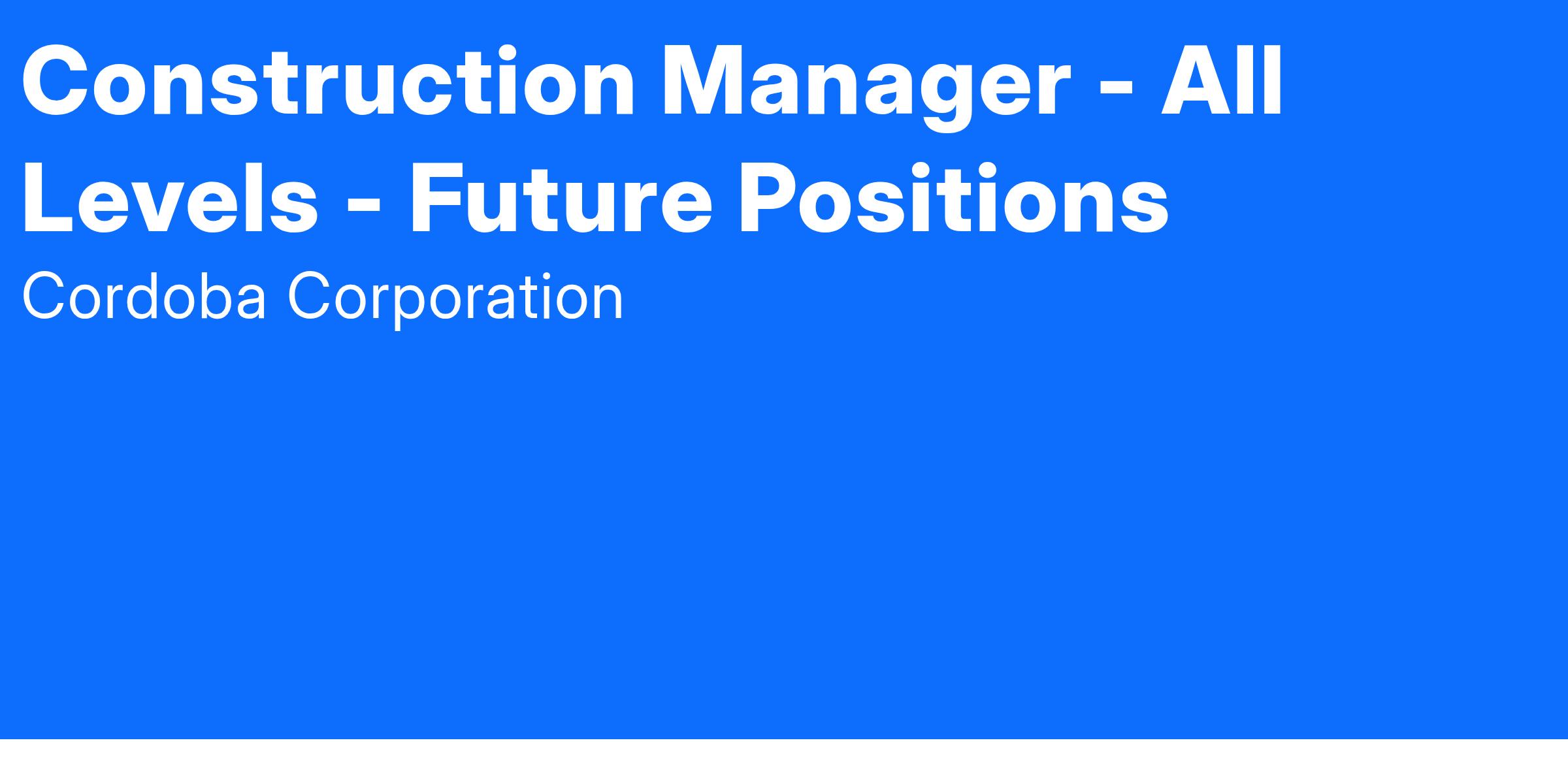 Calling all Construction Managers looking to advance their careers in construction management! We are Cordoba Corporation, a leading engineering firm offering construction management, AEC, program management and design solutions to clients throughout California. We are looking for talented Construction Managers for current and future projects at all levels (Level 1, 2, and Senior) to support a variety of exciting projects, including public works, capital improvement projects for K-12 schools, community college districts, public and private universities, city or municipal projects, and airport projects to name a few. If you are passionate about construction management, engineering and eager to contribute and have a positive impact, we want to hear from you!