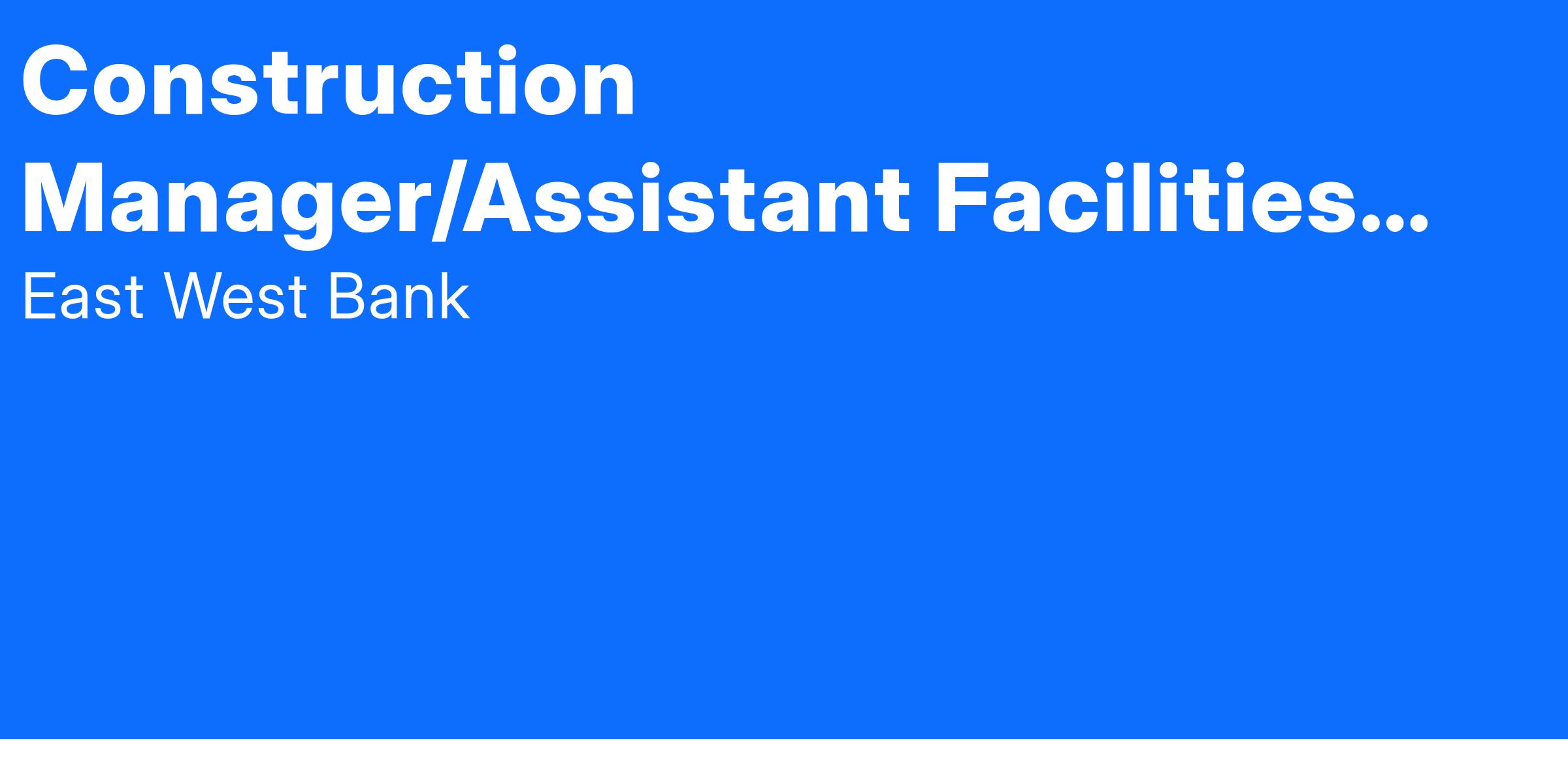 East West Bank has a long history of financial strength, award-winning building quality, and unwavering commitment to client satisfaction. We’re seeking a construction manager who has similar values and can put their expertise to work on a variety of initiatives. This person will be responsible for overseeing multiple projects simultaneously and serving as the worksite representative for dealings with internal business partners, subcontractors, architects, engineers and government inspectors. The construction manager will ensure compliance with all national and local procedures, regulations, and codes, and will provide progress updates to appropriate management channels on a regular basis. With every project, the construction manager will be counted on to drive the innovation we’re known for.