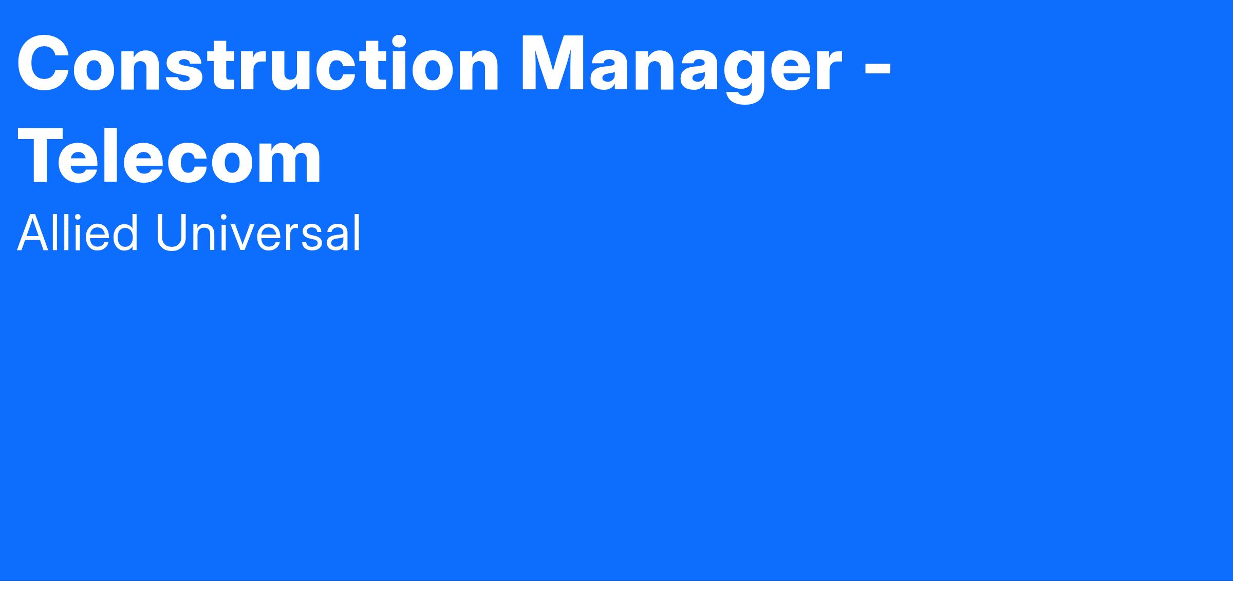 Adesta, an Allied Universal® Company, is hiring a Construction Manager - Telecom. The Construction Manager - Telecom represents the company in subcontractor pre-bid, pre-construction, and in-progress negotiations and is the customer interface on any construction-related meetings or items and any initial permitting contracts. This manager will effectively schedule the work and assign tasks to team members based on team member skills, competencies, and experience to meet or exceed the assigned tasks and provide professional development. The Construction Manager – Telecom leads by example in the engineering, permitting, and construction of the required scopes of work and supervises the team of fiber splicers and contractors to accomplish the required activities on schedule.